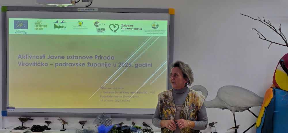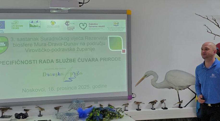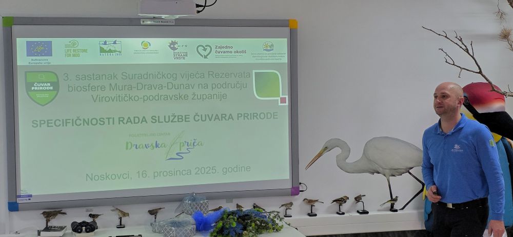 Danas, 16. prosinca 2025. godine, u sklopu provedbe projekata Preserving and restoring floodplain forest habitats along the Mura-Drava-Dunav (Project 101113557 — LIFE22-NAT-AT-LIFE RESTORE for MDD — LIFE-2022-SAP-NAT) i Ružičaste zloćke, u Posjetiteljskom centru Dravska priča održan je 3. sastanak Suradničkog vijeća Rezervata biosfere Mura-Drava-Dunav na području Virovitičko-podravske županije.